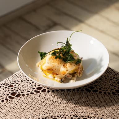 Nest pasta, ricotta, white ragù with seafood, delicate gratin