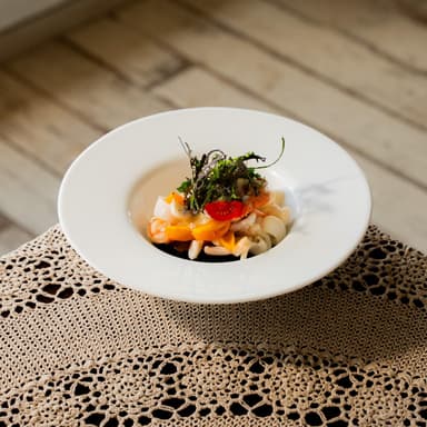 In broth of shellfish, tartare of horn-shrimp from Porto Santo Spirito