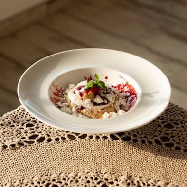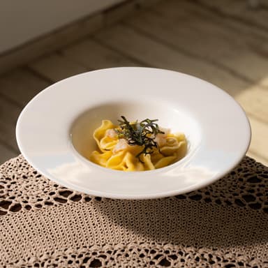 Nest pasta, ricotta, white ragù with seafood, delicate gratin