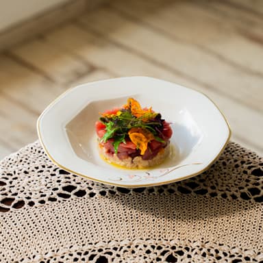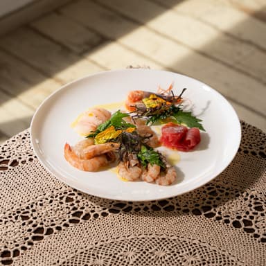 In brodo legato di molluschi, tartare di gambero monocero di Porto Santo Spirito
